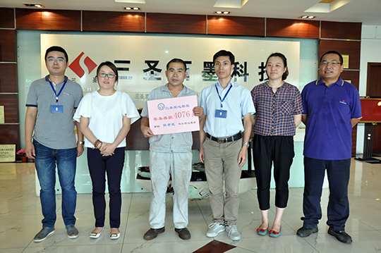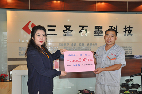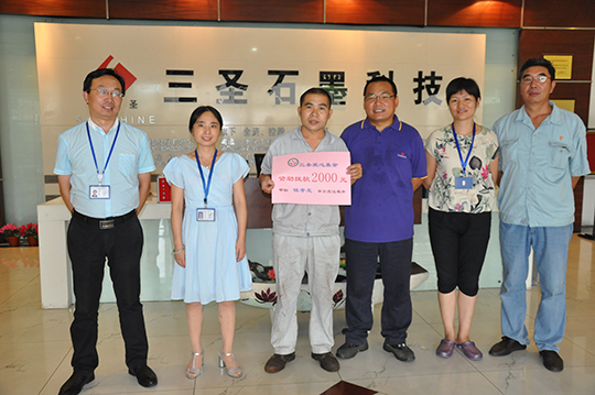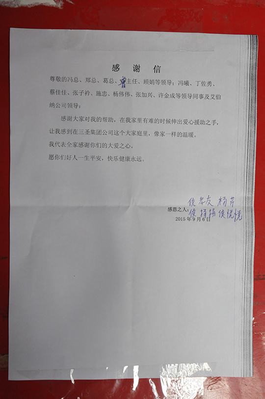 四、 董事长亲自捐赠善款救助听到侯孝友的实际困难汇报后,董事长非常关心,立即拿出私人款2000元现金资助,帮助侯孝友度过暂时的难关。郑董还亲自接待了侯孝友,详细了解了他家庭目前的状况,鼓励他树立信心,克服暂时困难,及时帮助妻子治疗,引导儿女安心学习,同时,希望他在公司本职工作中继续发扬不拍苦、脚踏实地的精神,积极专研技能,不要辜负三圣爱心传递的希望。