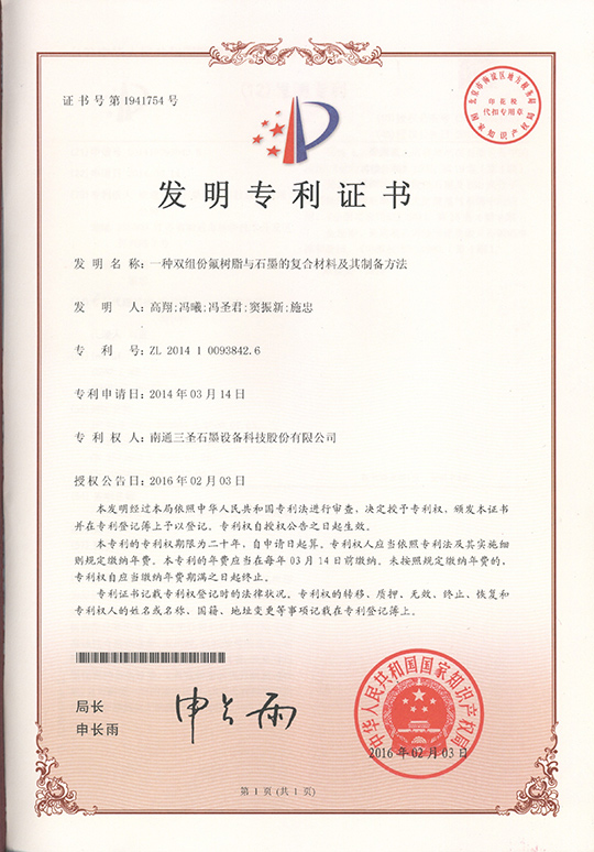 2016年2月18日,南通三圣石墨设备科技股份有限公司收到国家知识产权局的发明专利证书,该公司的发明专利"一种双组份氟树脂与石墨的复合材料及其制备方法"获得了国家授权。该项专利涉及一种完全意义上的新型氟-石墨复合材料,该复合材料既具有石墨优良的导热性能,又具有优异的耐腐蚀性能,由该种材料制成的换热设备可用于强腐蚀工况条件下的换热,打破了此前常规设备渗透压力耐受瓶颈,实现了钢铁酸洗工序上酸液换热设备的国产化。