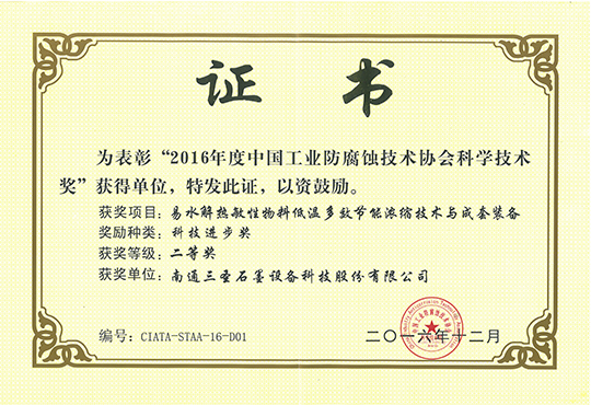 三圣石墨的“易水解热敏性物料低温多效节能浓缩技术与装备”获得中国工业防腐蚀技术协会颁发的科技进步二等奖。此次评奖一等奖空缺,我公司获得的奖项为石墨设备行业唯一的一个二等奖。