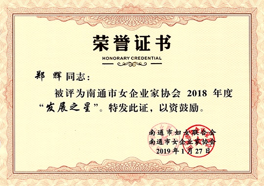 南通三圣集团副董事长郑辉女士被南通市妇女联合会、南通市女企业家协会评为2018年度“发展之星”,全南通市仅有8位女企业家获此殊荣。