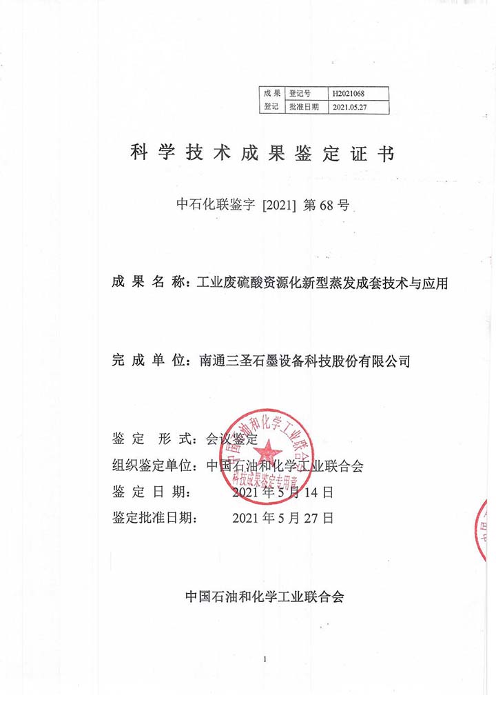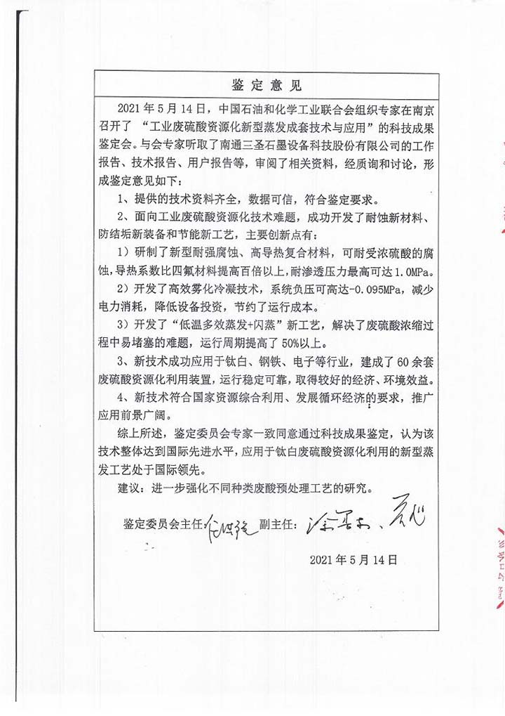 2021年5月27日,中国石油和化学工业联合会批准了南通三圣石墨设备科技股份有限公司“工业废硫酸资源化新型蒸发成套技术与应用”的科技成果鉴定,由南京大学任洪强院士担任主任,华东理工大学涂善东院士、南京工业大学乔旭校长担任副主任的鉴定委员会专家一致认为,该技术整体达到国际先进水平,应用于钛白废硫酸资源化利用的新型蒸发工艺处于国际领先。