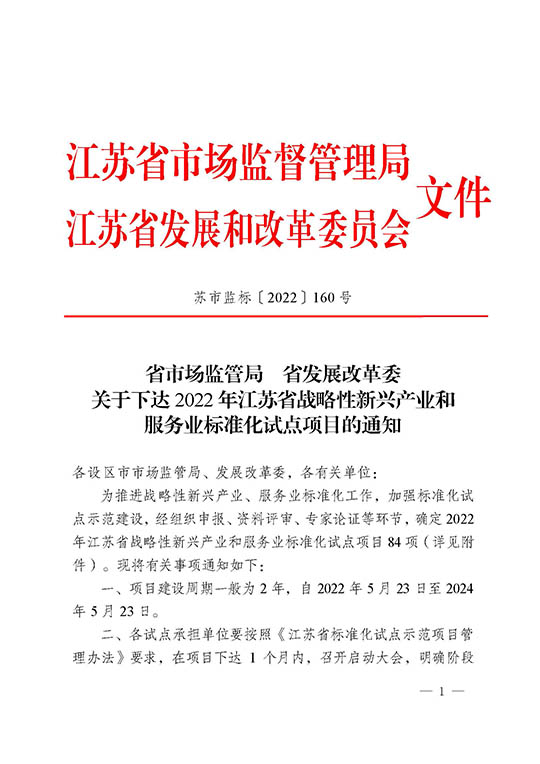 江苏省战略性新兴产业标准化试点项目由省市场监督管理局和省发展和改革委员会共同组织。项目对申报单位有着明确的要求:市场占有率和经济效益排名位于本地区同行业前列,具有良好的发展潜力,具备统筹技术创新、标准研制和产业化的能力等等。