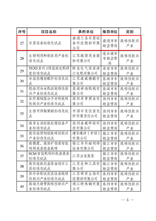 南通三圣标准化工作再传捷报,公司申报的“石墨设备标准化试点”项目获得江苏省市场监督管理局、江苏省发展和改革委员会正式立项,成为2022年江苏省战略性新兴产业标准化试点41个项目之一,也是南通市获此立项的两个项目之一 。