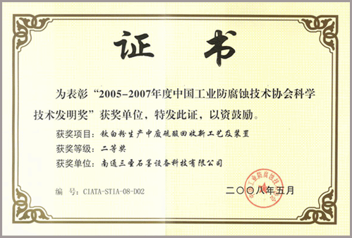 该技术通过了江苏省科技厅科技成果鉴定,先后获得:南通市人民政府科学技术进步二等奖、武汉市人民政府科学技术进步二等奖、中国工业防腐蚀技术协会科学技术发明二等奖并在多家钛白企业中得到了应用。