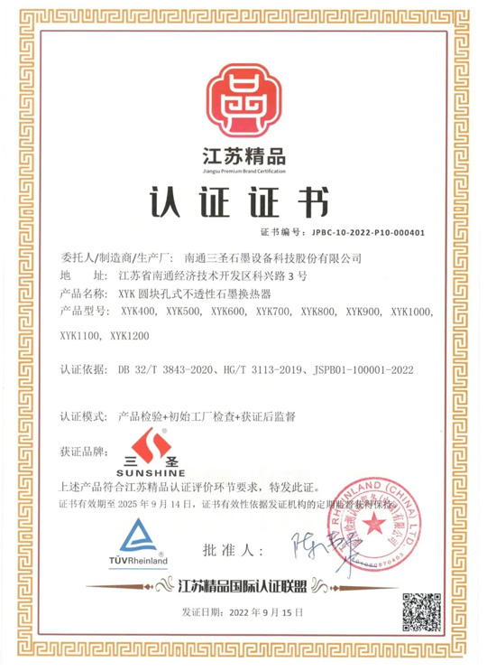 经“江苏精品”国际认证联盟认证,南通三圣石墨设备科技股份有限公司荣膺“ 江苏精品 ”认证 ,成功跻身“江苏精品”优质制造业品牌。