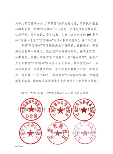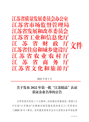 “江苏精品”是江苏省为推动形成一批自主创新、品质高端、服务优质、信誉过硬、市场公认的“江苏精品”品牌群体,以行业龙头骨干、“专精特新”和“单项冠军”等企业为主体认证对象,参照国际惯例、运用市场机制,由江苏省市场监管局会同省发改委等七部门开展的重点认证工作。