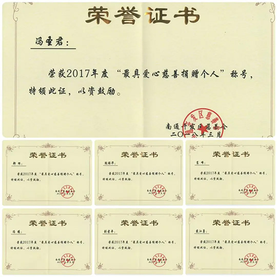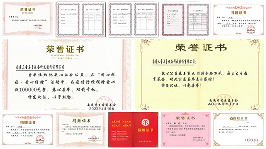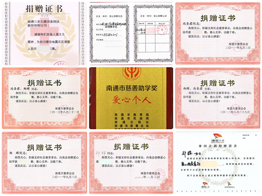 近二十年来,南通三圣企业集团通过设立专项基金、捐赠物资、组织志愿者服务、参加公益活动等多种形式,长期致力于教育助学、乡村振兴、应急救援、环境保护、助老助困等领域发挥自己的光和热,也曾受到政府各级的诸多表彰。