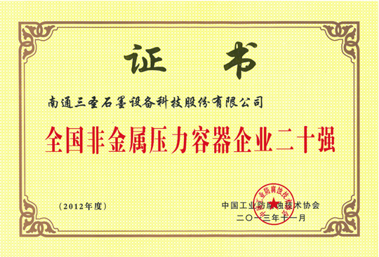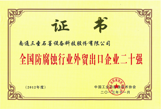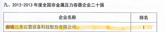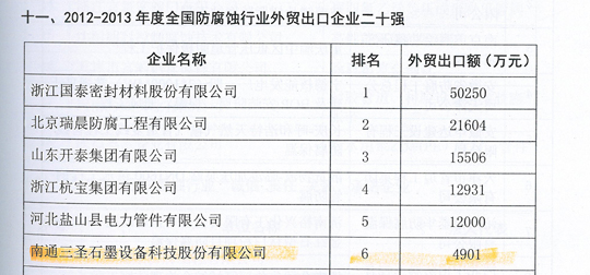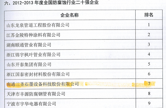 在刚刚闭幕的第五届中国国际腐蚀控制大会上,南通三圣石墨设备科技股份有限公司凭借其优异的业绩荣登三大榜单,分别是:"2012-2013年度全国防腐蚀行业二十强企业"(排名第7位);"2012-2013年度全国非金属压力容器企业二十强"(排名第1位);"2012-2013年度全国防腐蚀行业外贸出口企业二十强"(排名第6位)。