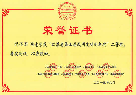 日前,三圣董事长冯圣君荣获"江苏省第三届民间发明创新奖"二等奖,成为行业内获此殊荣的企业负责人。 江苏省第三届民间发明创新评奖活动由江苏省知识产权局、江苏省农业委员会、江苏省总工会、江苏省科学技术协会、江苏省人力资源和社会保障厅、江苏省财政厅、共青团江苏省委、江苏省妇女联合会、江苏省发明协会等9个部门共同举办。